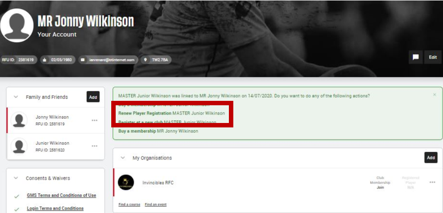 Player registration is an RFU requirement for any player to play for a rugby club and is separate from membership of a club. This example is to show a parent/guardian how to renew a player registration (now called affiliation) for an existing child (Age Grade player) who is already linked to Norwich RFC.